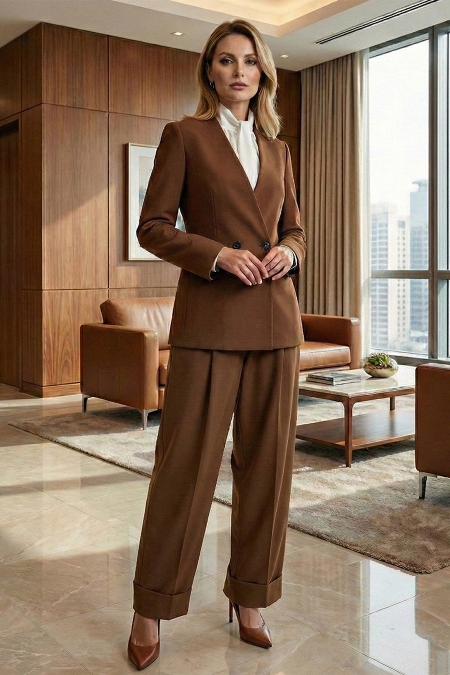 Элегантный брючный костюм воплощает идеальный баланс между деловой строгостью и расслабленной современной эстетикой. Внизу брюки оформлены широкими отворотами — стильной деталью, которая придает классическому фасону актуальное звучание.