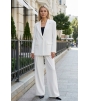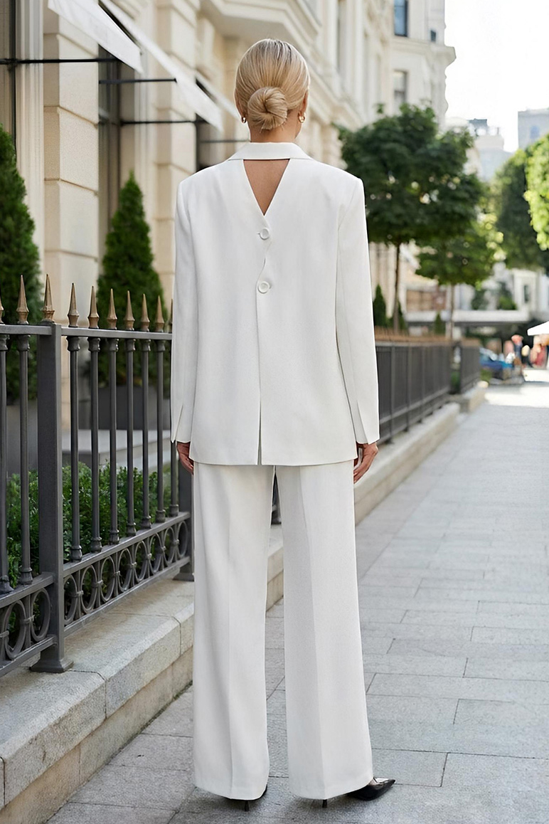 Этот белый брючный костюм — воплощение современной классики с интригующим акцентом. Спереди костюм демонстрирует сдержанность и благородный минимализм: жакет прямого кроя с аккуратным воротником и традиционными карманами с клапанами задает уверенный, чуть строгий тон. Эффектный дизайн жакета сзади ломает стереотипы о привычном дресс-коде, добавляя образу чувственности и архитектурной сложности.
