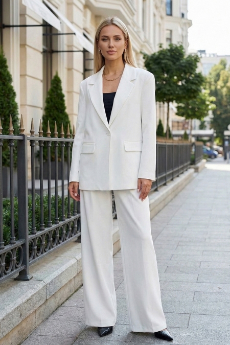 Брюки создают расслабленный, но собранный силуэт — ткань красиво струится при ходьбе, визуально вытягивая фигуру и добавляя походке легкой динамики. Чистый оттенок комплекта освежает и работает как идеальная база, позволяя экспериментировать с контрастными аксессуарами, хотя костюм достаточно самодостаточен, чтобы быть в образе без лишних дополнений.