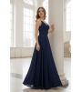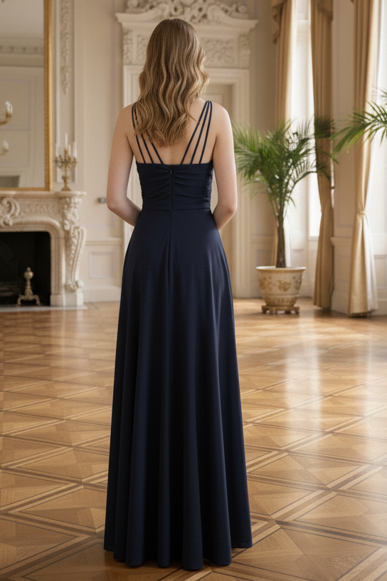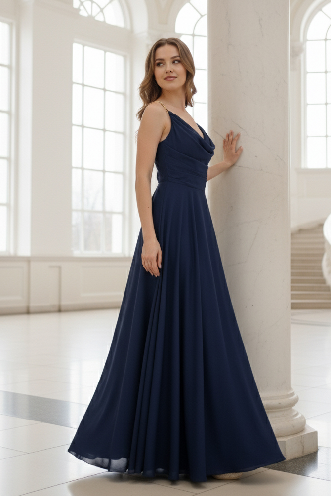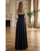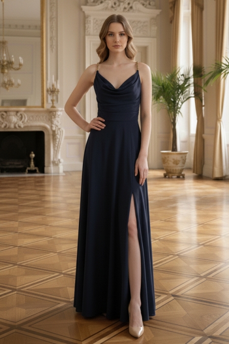 Это платье сочетает в себе классическую элегантность и современные акценты, создавая утонченный и запоминающийся образ. Модель выполнена из гладкой, струящейся ткани глубокого темно-синего цвета, которая красиво ниспадает, подчеркивая силуэт.