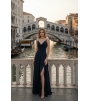 Приталенный крой четко очерчивает талию, переходя в длинную юбку. Длинная юбка свободно струится по фигуре и доходит до самого пола. Высокий разрез на одной ноге добавляет образу динамики и нотку притягательности, красиво открывая ногу при ходьбе. Открытая спина с переплетением нескольких тонких бретелей смотрится эффектно и элегантно.