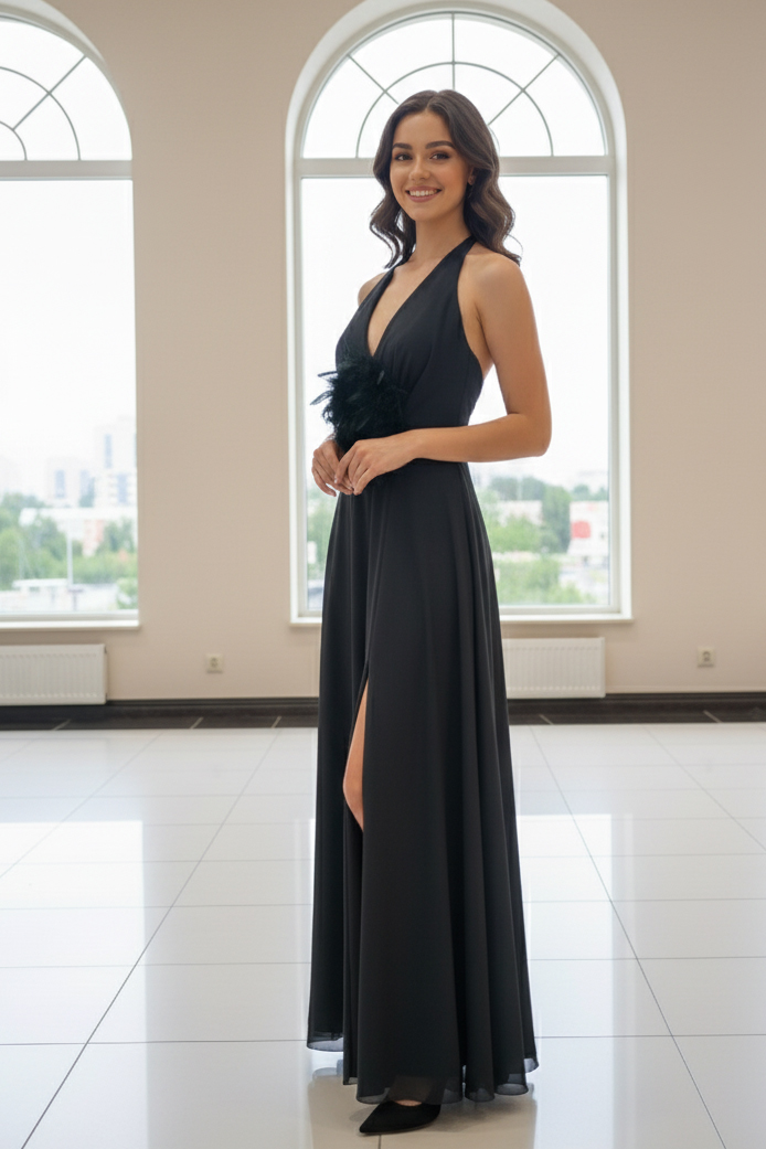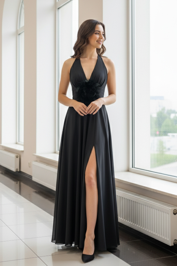 Черное вечернее платье в пол с глубоким V-образным вырезом