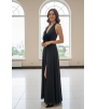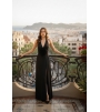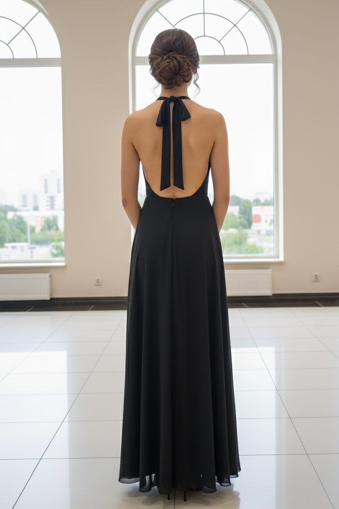 Классический черный цвет и струящаяся ткань этого платья создают утонченный и изысканный силуэт. Верх платья изящно завязывается сзади на шее. Эта деталь полностью открывает спину, добавляя образу нотку смелости и соблазнительности. Спереди крой подчеркивает фигуру благодаря глубокому V-образному вырезу.