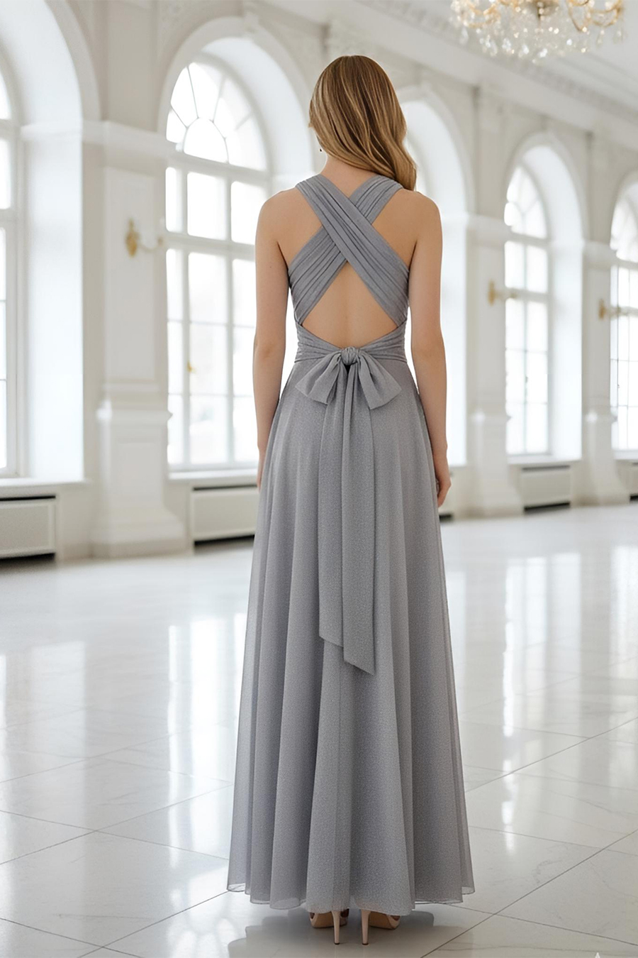 Эффектная открытая спина с перекрещивающимися бретелями придает образу романтичности и притягивает взгляд. Выразительный дизайн позволяет легко подобрать аксессуары к платью, создавая гармоничный и запоминающийся образ.