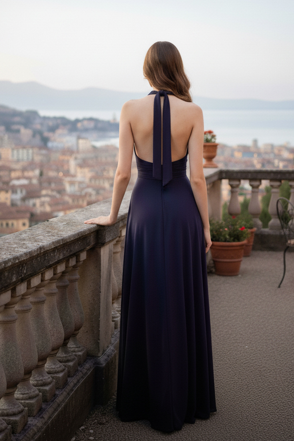 Платье с глубоким V-образным вырезом спереди. Широкие бретели элегантно обхватывают шею, переходя в длинные ленты, которые можно завязать в лаконичный узел или объемный бант. Этот крой полностью открывает плечи и спину, добавляя образу нотку утонченной соблазнительности. Длинная юбка красиво движется при каждом шаге, придавая образу легкость и воздушность.