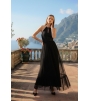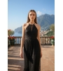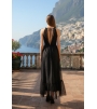 Верхняя часть платья оформлена изящным вырезом, который прекрасно подчеркивает линию плеч, придавая силуэту грациозность. Открытая спина добавляет смелости и чувственности, завязки на шее служат дополнительным декоративным элементом.