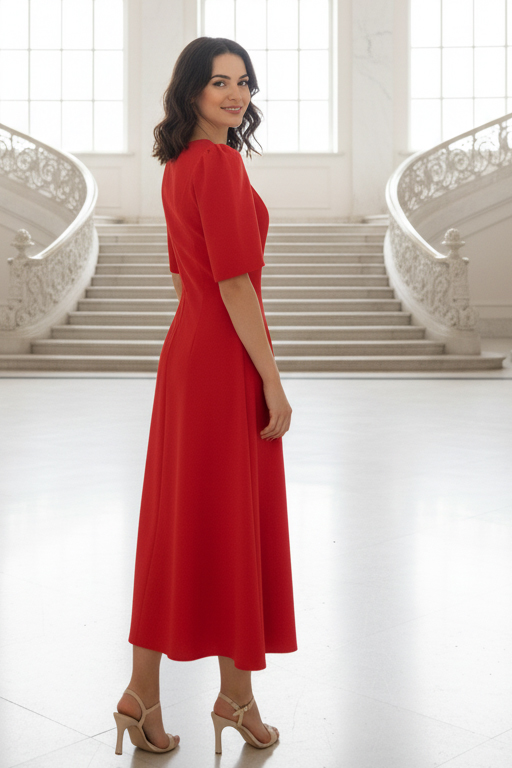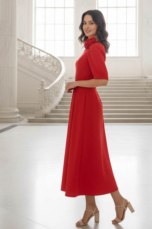 Это платье сочетает в себе строгую элегантность и выразительный акцент. Модель выполнена в насыщенном красном цвете, который привлекает внимание, оставаясь в рамках классического стиля.