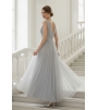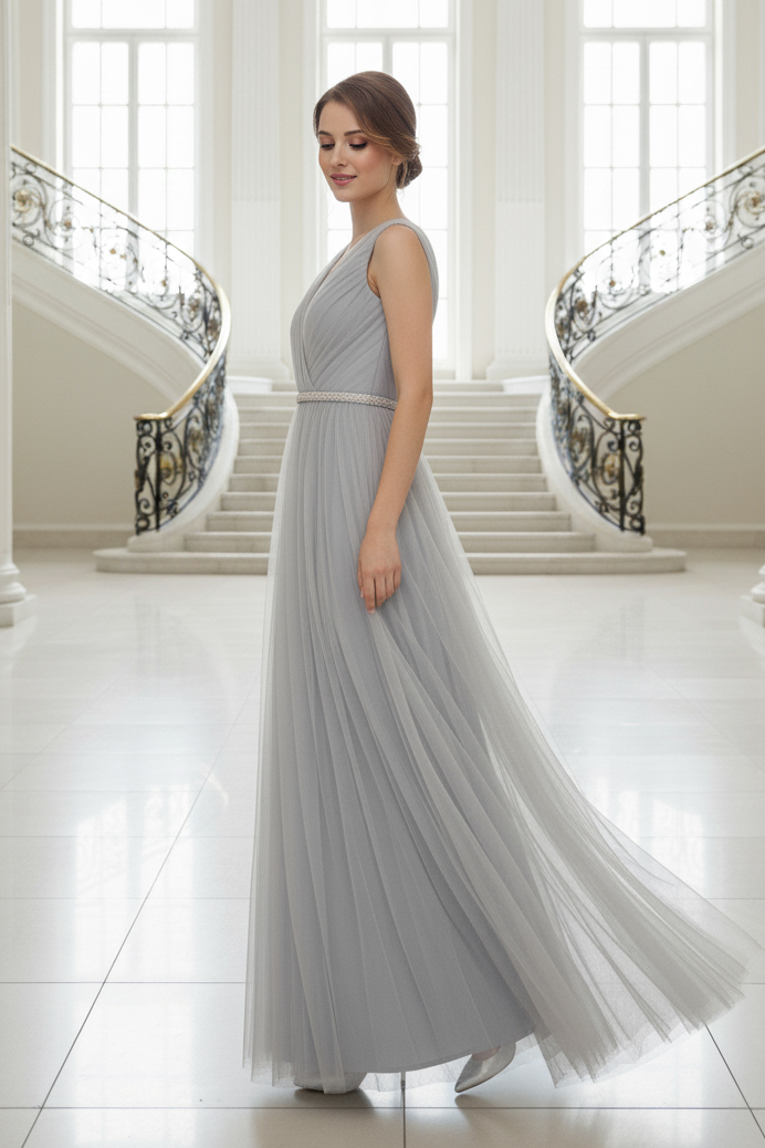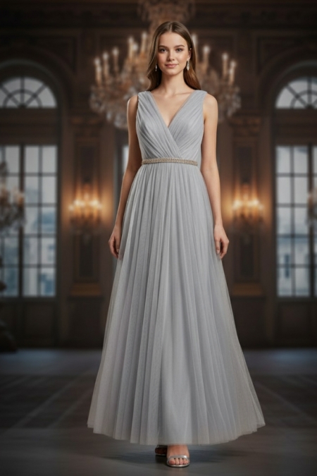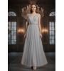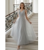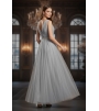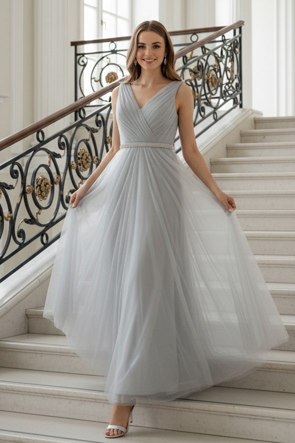 Платье выполнено в нежном оттенке, который напоминает туманное утреннее небо или мерцание лунного света, придавая образу загадочности и свежести. Этот цвет легко сочетается с различными аксессуарами, позволяя создать как классический, так и более современный образ.