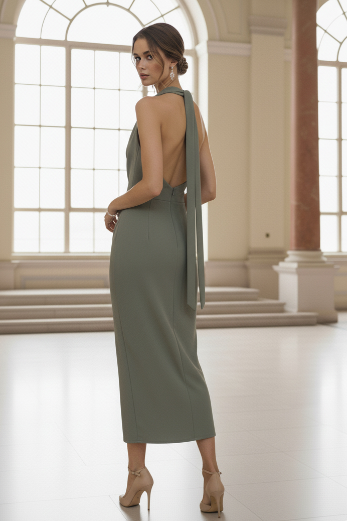 Это платье — воплощение сдержанной элегантности и утонченного вкуса в сочетании с современными деталями. Модель выполнена в глубоком оливковом оттенке, который смотрится благородно и универсально.