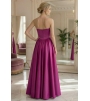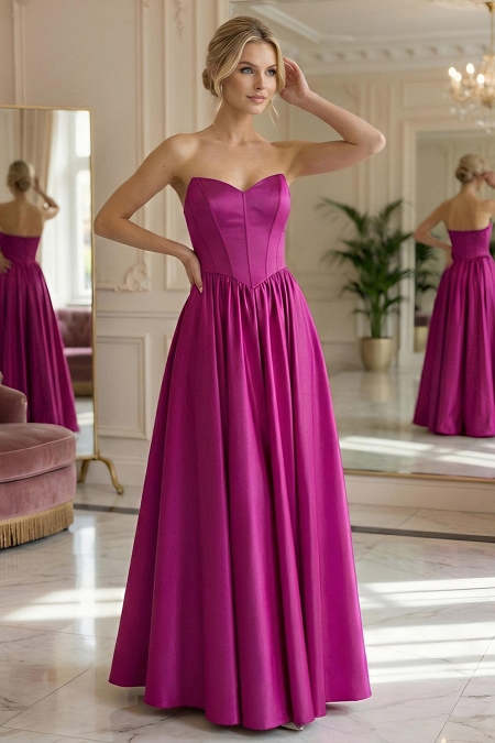 Вечернее платье выполнено в насыщенном оттенке фуксии, который притягивает взгляд своей глубиной и благородным переливом. Модель отличается жестким структурированным верхом обеспечивающим плотную посадку по фигуре с вертикальными рельефными швами визуально вытягивающими силуэт и формируют изящную талию.